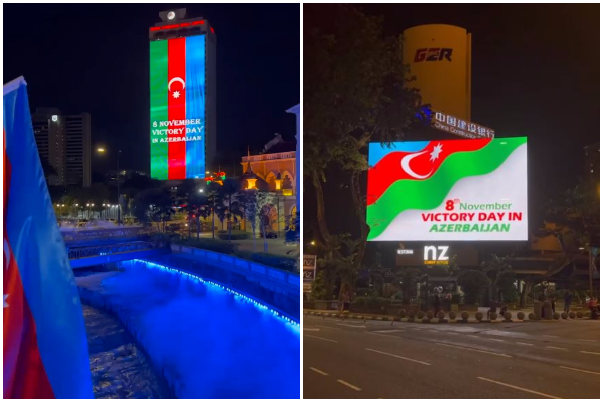 Ölkə paytaxtı Kuala-Lumpurdakı hündürmərtəbəli binalardan biri ölkəmizin bayrağı ilə işıqlandırılıb və üzərində müvafiq yazılar əks olunub.