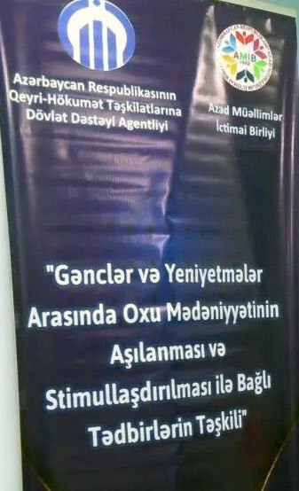 Azərbaycan Respublikasının Qeyri-Hökumət Təşkilatlarına Dövlət Dəstəyi Agentliyinin maliyyə yardımı ilə Azad Müəllimlər İctimai Birliyinin 01.02.2022-ci ildən 01.06.2022-ci il tarixinədək Bakı şəhərində həyata keçirdiyi “Gənclər və yeniyetmələr arasında oxu mədəniyyətinin aşılanması və stimullaşdırılması ilə bağlı tədbirlərin təşkili” adlı layihə çərçivəsində gənclər və yeniyetmələr üçün 10 seminar və 6 dərnək təşkil ediləcəkdir.