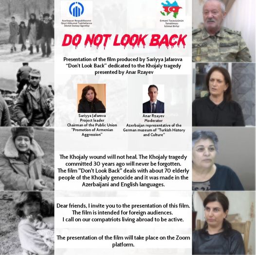 Xocalı soyqrımın 30 illiyi ərəfəsində 70 ahıldan bəhs edən”Geriyə baxma” kitabımın motivləri əsasında çəkilmiş,eyni adda bu filmin Zoom vasitəsi ilə keçirdiyimiz təqdimat mərasiminə dünyanın bir çox ölkələrində fəaliyyət göstərən diasporalar,QHT-lər, elm adamları qatıldılar, öz fikirlərini söylədilər.