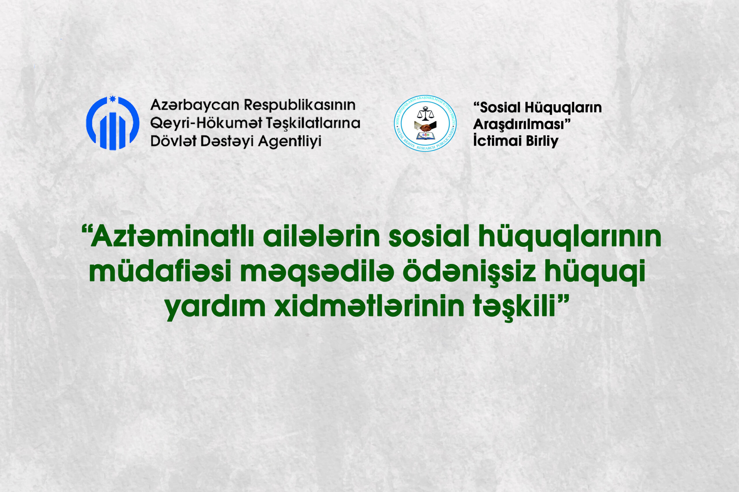 “Sosial hüquqların araşdırılması” İctimai Birliyi Azərbaycan Respublikasının Qeyri-Hökumət Təşkilatlarına Dövlət Dəstəyi Agentliyinin maliyyə yardımı ilə “Aztəminatlı ailələrin sosial hüquqlarının müdafiəsi məqsədilə ödənişsiz hüquqi yardım xidmətlərinin təşkili” adlı layihəsini həyata keçirməyə başlayıb. Layihənin əsas məqsədi əhalinin aztəminatlı və sosial müdafiəyə xüsusi ehtiyacı olan təbəqələrinin sosial hüquqlarla (əmək, tibb, sosial təminat, ailə, təhsil və s.) bağlı məlumatlandırılmasından, regionlarda “Ödənişsiz hüquqi yardım günləri”nin təşkil edilməsindən, vəkillərin, vəkilliyə namizəd olan nümayəndələrin, praktik hüquqşünasların, hüquq fakültəsi tələbələrinin, eləcə də sosial sahədə fəaliyyət göstərən QHT-lərin sosial hüquqlara dair biliklərinin artırılması üçün təlimlərin təşkilindən, sosial məsələlər üzrə hüquq klinikasında benefisiarlara ödənişsiz hüquqi yardım xidmətlərinin göstərilməsinin davam etdirilməsindən ibarətdir.