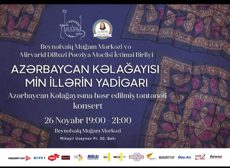 26 noyabr saat 19:00-da keçiriləcək konsertdə milliliyimizin simvolu olan kəlağayımıza həsr edilən rəngarəng ifalar, ruhunuzu oxşayacaq şeirlər səsləndriləcək. Eyni zamanda konsertdə Mirvarid Dilbazi Poeziya Məclisi İctimai Birliyinin təqdimatında, Azərbaycan Respublikasının Qeyri-Hökumət Təşkilatlarına Dövlət Dəstəyi Agentliyinin maliyyə dəstəyi ilə çəkilmiş “Azərbaycan Kəlağayısı, min illərin yadigarı” adlı səndli film nümayiş etdiriləcək.