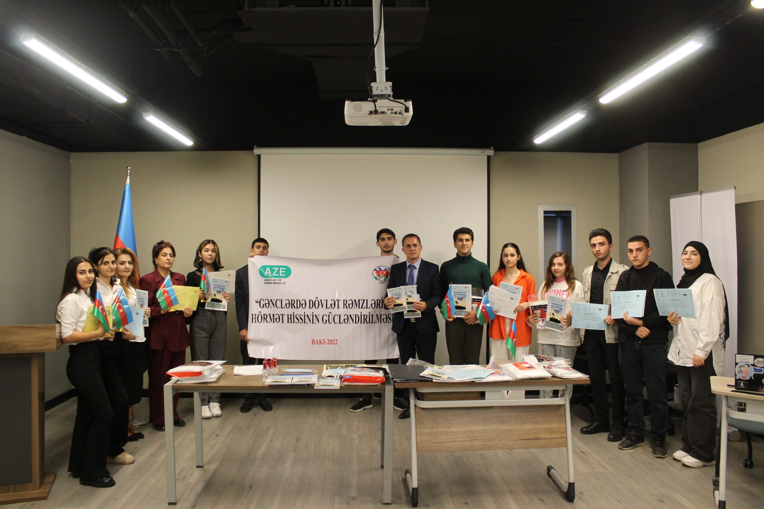 Gənc Vətənpərvərlər Birliyi Aərbaycan Respublikası Gənclər və İdman Nazirliyin maliyə dəstəyilə” “Gənclərdə dövlət rəmzlərinə hörmət hissinin gücləndirilməsi ” adlı layihə çərcivəsində Azərbaycan Respublikası Gənclər Təşkilatları Milli Şurasında “Dövlət rəmzlərinin təbliğində gənclərin rolu “mövzusnda elmi nəzəri praktik konfrans keçirilib. Layihənin rəhbəri , Muğan Əliyev tədbir iştirakcılarını salamlayandan sonra bir dəqiqəlik skutla Ulu öndərin və ümümi şəhidlərin ruhunu yad etdikdən sonra o, qeyd edərək bildirdi ki, 1990-cı il noyabrın 17-de Naxçıvan Muxtar Respublikası Ali Meclisinin qərarı ilə Muxtar Respublikanın Dövlət bayrağı kimi qəbul edilib. 1991-ci il fevral ayının 5-də Azerbaycan Respublikası Ali Soveti Naxçıvan Muxtar Respublikası Ali Məclisinin vəsadətinə baxıb və bayrağın Azərbaycan Respublikasının Dövlət bayrağı kimi qəbul edilməsi haqqında qərar qəbulu haqqında tədbir iştirakçıların nəzərinə çatdırdı.. Azərbaycan Respublikası Gənclər Təşkilatları Milli Şurasının sədri Azər Əliyev çıxış edərək bildirdi ki,Azərbaycan gəncliyi vətənpərvərlik əqidəsinə və humanizm hissinə malikdir. Gənclər arasında ,dövlət və dövlətciliyimizi, dövlət rəmzlərimizi daim təbliğinə ehtiyac var deyən A.Əliyev onuda qeyd etdi ki ,bu dövlətdə gəncliyin öz yeri vardır. Dövlət Azərbaycan gəncinə etibar edir, talehyüklü məsələlərin həllində onun iştirakını təmin edir. Cənab İlham Əliyev gənclərin potensial gücünə Azərbaycan dövlətinə bağlılıqlarına böyük önəm verir. Tədbirdə çıxış edənlər , Ş.Əliyev R.Qasımov, S.Həsənova, M.Çəfərova, layihə üzrə könüllü ekspert T.Maxmudov və digərləri mövzu ilə bağlı geniş ətraflı çıxış edərək bildirdilərki, uşaq, yeniyetmə və gənclər arasında dövlət atributları, tarix və milli qəhrəmanlarımız haqqında maarifləndirmə və təbliğat işlərinin aparılmasının zəruriliyini və orta təhsil müəsssisələrində dövlət bayrağın müqədəsliyindən və dəyərləri haqqında daim aşılanması işlərin aparılması xususi olaraq qeyd olundu. Sonra milli atriburlara dair Vidio- çarx nümayiş olunmuş suallar cavablandırılmışdr. Layihə iştirakçıları əsasən gənclərdən ibarət olub. Tədbirdə ictimayətinin nümayəndələri ,birliyin üzvləri və QHT-n nümayəndələri iştirak edirdilər. Tədbirin sonunda bir qrup fəal gənclərə Sertifikat,rəngli buklet ,bayraq və Ulu öndərin əksi olunmuş döş nişanı və təsvirli köynək paylandı.