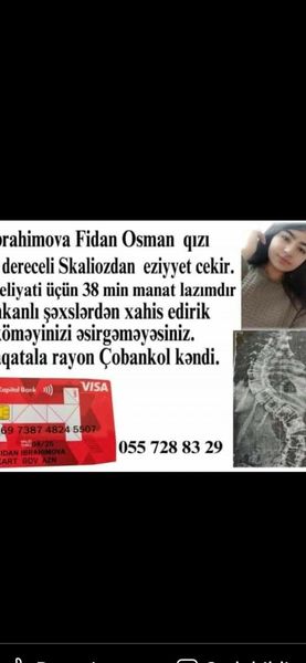 Dünya ana və uşaqlar ic. birliyi və Dünyaxeber.org Zaqatala rayon nümayəndəsi Xanım Nurullayevanin verdiyi məlumata görə, bir ay bundan qabaq bizə müraciət olunaraq, Zaqatala rayonu Çobankol kəndindən Ībrahimova Fidan Osman qızının 2 dərəcəli Skaliozdan əziyyət çəkirdiyini bildirmişdi. Xəstənin evində oldum, sənədlər və vəziyyəti ilə tanış oldum, əməliyyatına 38 min manat istənilmişdi ,imkanları olmadığından ailəyə köməklik etmək,facebook üzərindən kartını paylaşaraq köməklik olunmasını xahiş etmişdim.Paylaşımdan az müddət sonra Bakıdan Rəvan Məmmədov adlı şəxs əməliyyatı öhdəsinə götürdü,telefon nömrəsi verdi və ailənin əlaqə saxlamasını bildirdi.Bu gün əməliyyat uğurla keçib .