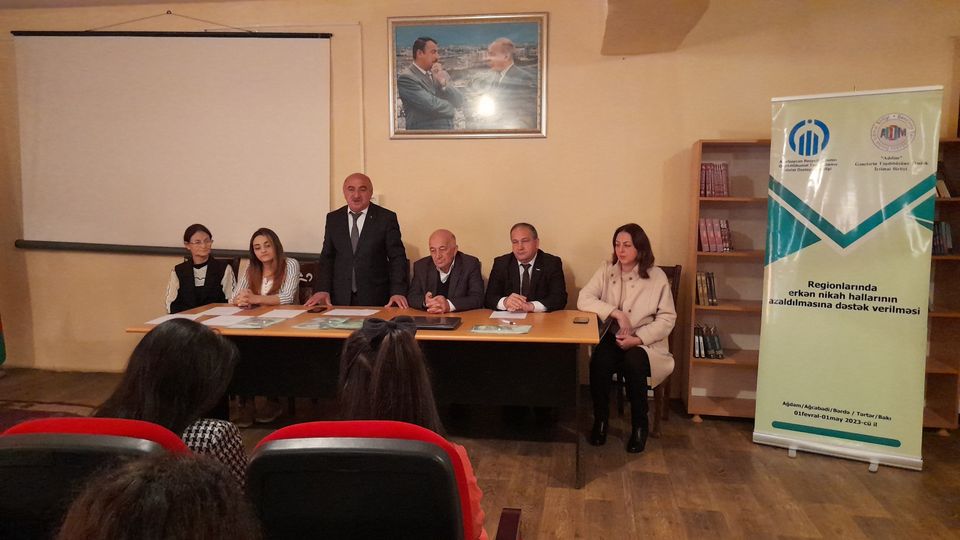 “Addım” Gənclərin Təşəbbüsünə Dəstək İctimai Birliyi Azərbaycan Respublikasının QHT-lərə Dövlət Dəstəyi Agentliyinin maliyyə dəstəyi ilə “Regionlarda erkən nikah hallarının azaldılmasına dəstək verilməsi” layihəsini uğurla başa çatdırdı. Layihənin əsas məqsədi regionlarda erkən nigah hallarının azaldılmasına dəstək verməkdən ibarət idi. Layihə çərçivəsində Ağdam, Ağcabədi, Bərdə və Tərtər rayonlarında 12 tədbir keçirildi. Tədbirlərdə erkən nigahın səbəbləri və fəsadları barədə əhali məlumatlandırıldı.Tədbirlərdə həm 13-17 yaşlı uşaqların valideynləri, 15-17 yaşlı uşaqlar, həm də cəmiyyətdə tanınan ziyalılar iştirak etdi. Tədbirlərdə erkən nigahlar və onların fəsadları mövzusunda təqdimatlar olundu maariflədirmə işi aparıldı, mövzu ətrafında geniş müzakirələr oldu və təkliflər səsləndirildi.