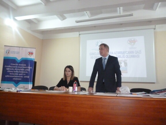 Azərbaycan Respublikasının Gənclər Fondun maliyyə yardımı ilə Gənc Vətənpərvərlər “İctimai Birliyi (GVİB) “ Gənclər arasında Azərbaycanın ərazi bütövlüyü uğrunda döyüşlərdə şəhid olmuş hərbçilərimizin, həmçinin qazi və qəhrəmanlarımızın təbliğ olunması “adlı layihə çərçivəsində “Azərbaycanın ərazi bütövlüyü uğrunda İkinci Qarabağ – Vətən Müharibəsi döyüşlərində iştirak edən qazi və şəhid olmuş hərbçilərin təbliğində gənclərin rolu” ” mövzusunda Azərbaycan Turizm və Menecment Universitetinin təşkilatcılığı ilə elmi nəzəri praktik konfrans keçirilib. Tədbiri giriş sözü ilə açan Azərbaycan Turizm və Menecment Universitetin Karyera ve kommunikasiya sobesinin rehberi Elnurə Əliyeva tədbiri açıq elan etdikdən sonra bir dəqiqə sükutla Ulu öndər Heydər Əliyevin və şəhidlərimizin ruhu yad edilib . Sonra o qeyd etdi ki, Azərbaycanda 2–ci Qarabağ döyüşlərində iştirak edən qazi və qəhrəmanlarının təbliğ olunması ilə bağlı maarifləndirmə kampaniyasına ehtiyac var . Layihənin rəhbəri M. Əliyev qeyd edib ki, , Gənclər arasında Azərbaycanın ərazi bütövlüyü uğrunda 2 –ci Qarabağ və 24 saatlıq antiteror döyüşlərində iştirak edən qazi və şəhidlərin, şəhid olmuş hərbçilərin, həmçinin qazi və qəhrəmanlarının , işğaldan azad edilmiş torpaqlarımızda məskunlaşmada keçirilən tədbirlərdə,görüşlərdə gənclərin marağı artırılmış, eyni zamanda Azərbaycan xalqının əzmi və iradəsi, iqtisadi gücü, müasir ordu quruculuğu və xalq-iqtidar birliyi ölkəmizin İkinci Qarabağ müharibəsində qələbəsini əhali arasında yüksək olduğunu deməyə əsas verir. “ Layihə üzrə könüllü təlimci Qarabağ qazisi Asif Rəsulov geniş ətraflı cıxış edərək qeyd etdi ki, günü ən aktual mövzusu hərbi vətənpərvərlik tərbiyəsinin gənclər arasında təbliğ olunmasıilə yanaşı, Azərbaycanın ərazi bütövlüyü uğrunda iştirak edən qazi və şəhidlərin, şəhid olmuş hərbçilərin, həmçinin qazi və qəhrəmanlarının təbliğ olunmasından ibarət olmalıdır. Tədbirdə həmçinin Universitetin 3-сu kurs tələbələri Bəndəliyev Sənan, Yusifzadə Abbas, Kamallı Nəzrin, Salmamova Gülayə, Baratlı Esmira, Abbasova Yeganə, Mürfətli Mətin,Abbdulayev Rəvan və və digərləri çıxış edərək bu yönümlü layihələrin keçirilməsinin vacibliyindən söz acıb. Daha sonra tələbələrin sualları cavablandırılıb. Tədbirdə Azərbaycanın qazi və qəhrəmanlarının təbliğ olunması haqqında ümumi anlayış və terminalogiya mövzularında tələbələrə, qonaqlara maarifləndirici buklet və təsvirli köynək və Heydər Əliyevin əksi olunmuş döş nişanı paylanılıb . Sonda ,Azərbaycanın qazi və qəhrəmanların döyüş yolunu əks etdirən videoçarx nümayiş olunub. Layihə iştirakçıları əsasən 19-20- yaş arası olan gənclərdən ibarət olub. Tədbirdə, Turizm və Menecment Universitetini Biznes idarəçiliyi ,Sosial menecment ,Turizm və qonaqpərvərlik fakutəsinin tələbələri Universitetin pedoqoji kollektivi , rayon ictimaiyyət nümayəndələri, Qarabağ qaziləir ,GVİB-n İdarə Heyəti və Qeyri-Hökumət Təşkilatlarının nümayəndələri və könüllülər iştirak ediblər Tədbirin keçirilməsində əsas məqsəd 2–ci Qarabağ döyüşlərində iştirak edən qazi və şəhidlər haqqında məlumatlandırma ilə yanaşı, həmçinin qazi və qəhrəmanlarının gənclər arasında mütamadi təbliğ olunmasıdır . Qeyd edək ki, layihə Gənclər Fondunun dəstəyi ilə həyata keçirilir. GVB-n mətubat və informasiya şöbəsi.